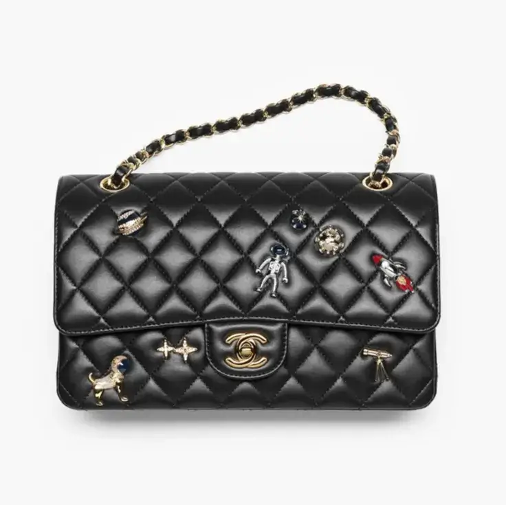 - 新款香奈儿经典口盖包本季加入嵌入式挂饰。有外星飞船、星星、外星人 & 火箭挂饰,配新版双C标志(和原来不一样)。你觉得怎么样?(款式代码:A01112)