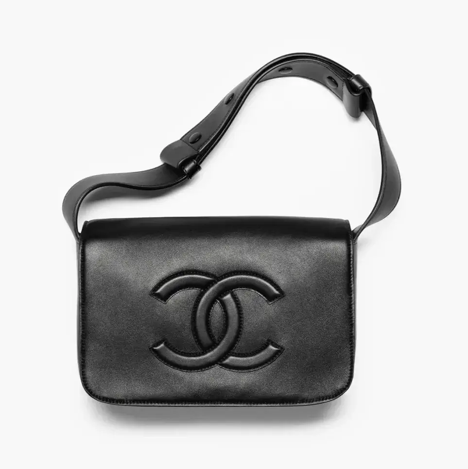 - 另一款值得关注的包是香奈儿邮差包。用小羊皮制作。中间是大印花双C标志。肩带可调节但不可拆。完全没有五金,就是纯皮。(款式代码:AS6222)